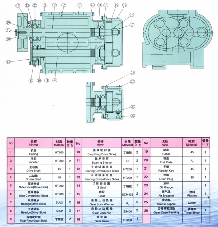 三葉羅茨風(fēng)機(jī)主要用作排氣的機(jī)械設(shè)備,三葉羅茨鼓風(fēng)機(jī)的優(yōu)點(diǎn)是,在中心距離和外圓半徑相同的情況下,弧葉型三葉轉(zhuǎn)子羅茨鼓風(fēng)機(jī)比兩葉的位移大。漸開(kāi)線葉型羅茨鼓風(fēng)機(jī)的位移與轉(zhuǎn)子的頭數(shù)無(wú)關(guān)。三葉轉(zhuǎn)子羅茨鼓風(fēng)機(jī)的振動(dòng)和噪音比二葉小,三葉轉(zhuǎn)子使用的軸承壽命比二葉使用的長(zhǎng)約15%。另外,三葉轉(zhuǎn)子可以使用扭轉(zhuǎn)轉(zhuǎn)子來(lái)減少噪音和振動(dòng),二葉轉(zhuǎn)子由于結(jié)構(gòu)限制,不能使用扭轉(zhuǎn)葉片結(jié)構(gòu)。三葉轉(zhuǎn)子的力學(xué)性能比較好,比二葉更能保證葉輪之間和葉輪與外殼之間的間隙。三葉轉(zhuǎn)子羅茨鼓風(fēng)機(jī),特別是扭曲的葉型,噪音和動(dòng)平衡性能好,在汽車(chē)機(jī)械增壓方面的應(yīng)用越來(lái)越多。